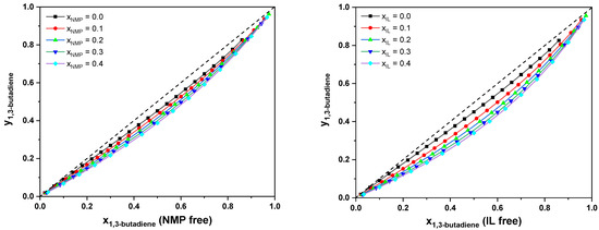 Vapor–liquid phase diagrams of {butadiene-butene-NMP} (left) and {butadiene-butene-[PMIM][MCO]} (right) at 298.15 K.