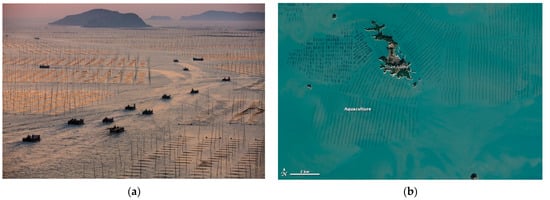 (a) Seaweed farmers along the coast in Fujian, China. (b) Seaweed and oyster aquaculture on Sisan Island in South Korea.