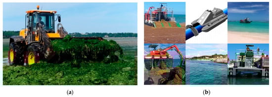 (a) Seaweed harvesting in Britany, France. (b) Sargassum harvesting by Algenova in the Dominican Republic.