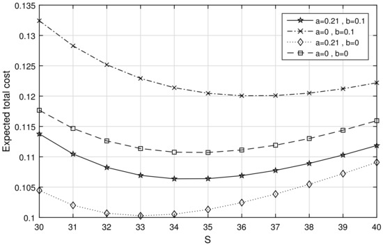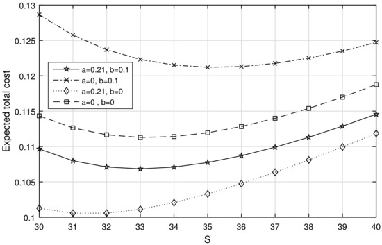 The two dimensional, local convexity of the expected total cost curve() is obtained when the maximum number of items(number of pen-drive) S lies in the integer interval [30,40] with regard to pre-fixed reorder level , and which are shown in Figure 1, Figure 2 and Figure 3 respectively. Each figure depicts the convexity of the curve under the classification of stock-dependent (SD) and non-stock-dependent (NSD). Each curve in those diagrams has a minimum point, which is referred to as the optimum point. That is, the estimated overall cost of pen-drive sales should be kept to a minimum (optimized). These curves show the total cost of the pen-drive sales when the arrival is wholly SD () and NSD () or partially SD (, and , ). Because the optimum total cost is determined for both fully SD (or NSD) and partially SD arrivals, the organizer can pick for either the purely SD (or NSD) or partially SD arrival approach to boost pen-drive sales profits. The contrasting results of both solely and partially SD arrival processes are also shown in the Figure 1, Figure 2 and Figure 3. This will be valuable to all readers as well as business tycoons who are in the inventory business (electric and electronic items, home appliances, etc.) and apply any of the arrival policies depending on their business plan. The optimal predicted total cost of the pen-drive store is attained when the store follows a partially SD arrival method, as shown in all three figures. However, if the s varies, one can see that the best-reduced cost varies continually. They will determine the critical reorder level to attain the optimal S, as indicated in Figure 1, Figure 2 and Figure 3. Overall, at the middle reorder level , the optimum estimated total cost of the pen-drive business exists. The overall expenditure of the store may be regulated with the help of this shown case, which shows the optimal predicted total cost of the pen-drive business and the best fit of the reorder point.