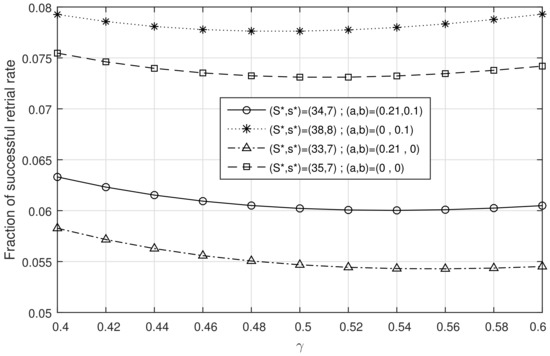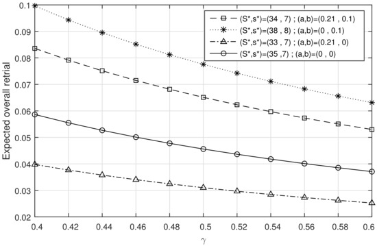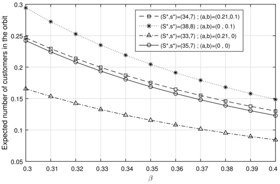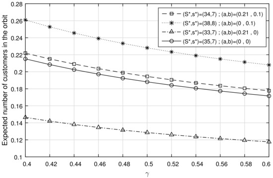 In Table 2, Table 3, Table 4 and Table 5, under the parameter variation, optimum stock level, reorder level, total cost and expected inventory level, re-order rate, the average customer in the orbit are discussed. When we raise the arrival rate (both zero and positive stock or and ) and the scale factors a and b and the retrial rate, are proportional to optimum stock level, reorder level, total cost and expected, re-order rate, the average customer in the orbit separately. The number of customers entering the system per unit time has increased as the average arrival rate has increased. The system must stock a larger quantity of products in order to satisfy or give service to all of the arriving clients. If the current stock level falls below the reorder level quickly, the replenishment of Q goods may be replaced promptly. If the replenishment does not take place right away, the current stock level will be depleted. Any arriving customer who discovers that the inventory level is empty may be sent into orbit. The scaling factors a and b perform the same function as . On the other hand, the re-order intensity rate, influences the measures optimum stock level, reorder level, total cost and expected inventory level, re-order rate, the average customer in the orbit in the inverse direction. This is because the existing stock level of the system is increased if the replenishment time is reduced. Since the re-ordered quantities arrive quickly, the store owner can provide the service as much as possible. If the service completion is to be done fast, the estimated measures taken into this case are to be decreased. Similarly, the vacation completion time (if is increased) ends as soon as the server starts his work immediately. Suppose the customer finds that the server is in working mode, the number of the customer going to orbit will reduce. On following that the optimum stock and reorder level also decreased. In addition, the orbital customers also get the opportunity to get a quicker service. So that the customers expected total and successive retrial rates are reduced. This illustration inspires the readers to develop the stock-dependent arrival strategy in their business. Many businesses nowadays use social media to display their products in the most efficient way in order to enhance client traffic. The expansion and development of the inventory industry will be aided by such arrival dependencies.