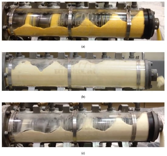 Stability and variable flow rate testing shows that, as particle size increases (for corn and wheat powders), the energy requirements for confined and unconfined flow decreases (Table 2). The increase in energy with smaller particles can be attributed to an increase in surface area that increased the interparticle friction resulting in higher resistance to flow []. This higher flow resistance with decreasing particle size translated to poor granular flow in extrusion as could be seen from the visualization trials on the pilot-scale single screw extruder (Figure 2). Higher barrel fill for corn flour versus corn meal, and similarly higher barrel fill for wheat flour versus wheat farina, was a direct result of poor flowability of the finer particle size material in each case. Trials for corn and wheat starches on the extruder were not done, but it is reasonable to extrapolate from the above results that they will exhibit poorest flow, as has also been noted anecdotally. The SI results shows that corn flour and corn starch both compact during the testing, while corn meal slightly expands as the blade rotates through the sample (Table 2). The FRI shows that corn starch is more sensitive to changes in blade speed when compared to corn flour and corn meal. The FRI also shows that wheat starch was more sensitive to changes in blade speed when compared to wheat flour or wheat farina (Table 2). This could be due to the shape of the particles, as the SI of 1.0 indicates that farina tends to neither compact nor expand throughout the testing process. Contrarily, the starch and flour powders settled and compacted during the conditioning of the test and required noticeably more energy when blade speed was reduced for FRI testing. With a FRI value of < 1.0 for farina (Table 2), it can be inferred that a slower blade speed is more energy efficient for moving through the particles. From this test, it can also be concluded that for mixing or conditioning the wheat farina samples, slower mixing blade speeds have to be employed.