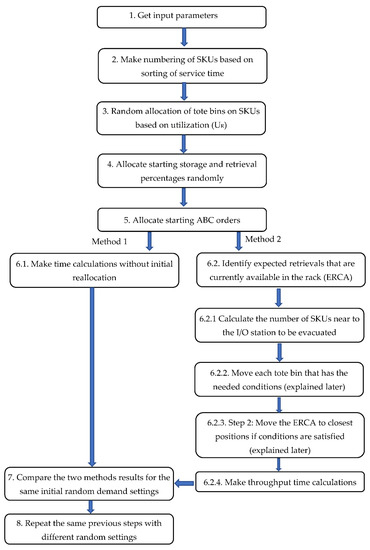 Figure 3. Method 1 defined in the block number 6.1 is when there is not any preparation before the working shift. On the other hand, method 2 (block number 6.2) and the later blocks until the block with the number 6.2.4 are for the case in which there is the two-step method proposed in this study. The last step with the number 8 is performed to make the comparison between the two methods more solid by having more trials of simulation with more possible random initial locations of storage. The input parameters are as follows: