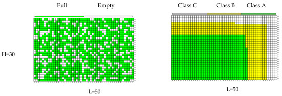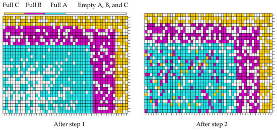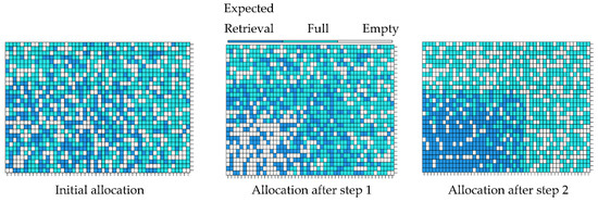 Figure 7 shows the orders expected to be retrieved before the start of the working shift, after step 1, and after step 2. A considerable number of the existing bins is expected to be retrieved in the next few hours. Such bins are not affected in the first step in which non-needed bins are moved away from the area close to the dwell point to make some space for the movement in step 2. Expected retrieved bins are moved in step 2 to the area close to the dwell point, even if they are not classified as A-items. The effect of that on the new locations for A, B, and C items is shown in