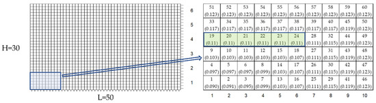 Figure 5 shows a part of the rack with cell numbers and travel durations. These numbers are from the lowest service time to the longest service time. In other words, the cell next to the dwell point (0, 0) has the number 1, and the farthest cell is with the maximum number. The shaded part in the left-hand side is magnified in the right-hand side of the figure. The arrow is to show that. Thus, all the figure on the right side is just a small part of the figure on the left side. The service time found using Equation (1) is written inside the parentheses. There are some adjacent cells with the same service time. According to Equation (1), for instance, the adjacent cells with numbers 19 to 24 have the same travel time to the I/O station. Therefore, relocating tote bins within this group of cells is not useful during the preparation period. The average number of cells with the same travel time (ANCST) can be determined using Formula (4)