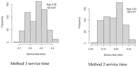 19], to get the utilization of 90% in the initial case, the inter-arrival time must be about 0.29 min. In this case, the average waiting time per order will be 1.25 min. If the inter-arrival time of 0.29 min is kept in method 2, then the waiting time per order will be 0.49 min. Therefore, when the number of orders is 600, the total waiting time of all orders for method 1 is 750 min, and the total waiting time for method 2 is about 294 min.