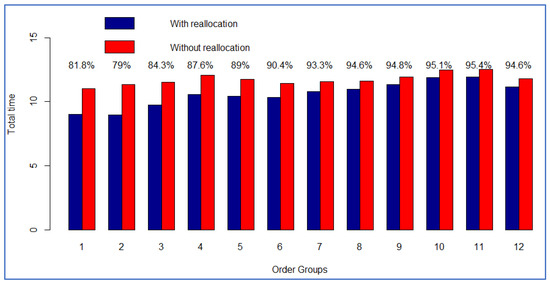 Figure 11 shows the comparison between the total service time for the order groups, where each group is 50 orders. Since the number of orders is 600, there are 12 groups of orders. Savings are higher for the first groups, since the number of expected retrieval loads initially found in preparation is higher at the beginning of the working shift; it then starts to decrease with time.
