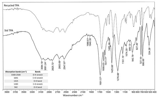FTIR analysis of a solid product obtained after hydrothermal degradation of colorless PET waste confirmed that the product contains main monomer TPA of high purity. According to Figure 4, recycled TPA presents the same characteristic absorption bands as the standard of TPA. The main IR bands of recycled TPA and TPA standard are shown at 3300–2500 cm−1 (O-H stretch), at 1683 cm−1 (C=O stretch), at 1425 cm−1 (O-H bend), at 1283 cm−1 (C-O stretch), and at 948 cm−1 (O-H bend). Similar results of the functional groups of TPA have been reported previously [19,20].