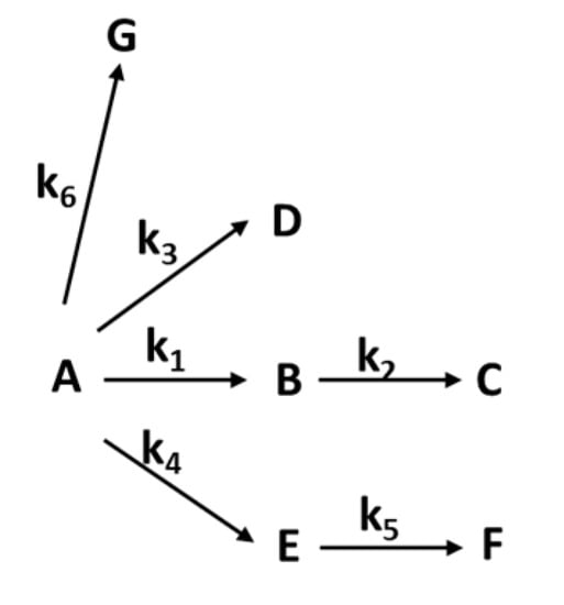 where: is the concentration of PET waste, the concentration of TPA, the concentration of benzoic acid, the concentration of 1,4-dioxane, the concentration of EG, the concentration of acetaldehyde and the concentration of IPA; k1, k2, k3, k4, k5 in k6 are the reaction rate constants of individual reactions, and t is the reaction time.