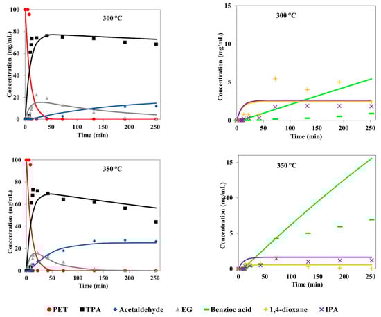 Colorless PET waste and its degradation products: TPA, EG, benzoic acid, 1,4-dioxane, acetaldehyde, and IPA at temperatures of 300 and 350 °C during heating period (first 12 min) and reaction at constant conditions. The symbols represent experimental measurements, while the curves represent a kinetic model.