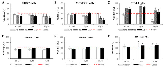 As expected, the cell viability of ATDC5, MC3T3-E1, 3T3-L1, and PB-MSCs when grown in GM only (spontaneous viability) increased over time (Supplementary Material, Figure S2). PHb reduced the viability of ATDC5 cells at all analyzed concentrations after 48 and 72 h cultivation and exhibited this effect after 24 h at a concentration of 10 μM only (Figure 1A). A similar inhibitory effect of PHb was observed in the culture with MC3T3-E1 cells. It decreased their viability at all three concentrations after 48 h in culture, and at a concentration of 10 μM after 72 h (Figure 1B). Contrarily, PHb stimulated the viability of 3T3-L1 cells at all tested concentrations after 48 and 72 h in culture, while it had no effect on the cell viability at concentrations of 0.1 and 1 μM after 24 h and decreased it at a concentration of 10 μM (Figure 1C).