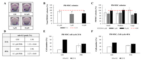 The number of apoptotic PB-MSCs (depicted by the percentage of the hypodiploid “sub-G1” peak in the DNA fluorescence histogram in Figure 2D) grown in GM only did not differ significantly from the quantity of apoptotic PB-MSCs grown in GM supplemented with PHb (Figure 2D). When PB-MSCs grew in CM only, ~20% and ~35% were in the G0/G1 phase after 24 and 48 h, respectively (Figure 2E,F). The analysis of the impact of PHb on PB-MSCs’ cell cycle progression showed that PHb induced the transient cell cycle arrest of PB-MSCs, with ~45% cells in the G0/G1 phase after 24 h (Figure 2E) and ~35% in the same stage of the cell cycle after 48 h (Figure 2F) (Supplementary Material, Figure S3).