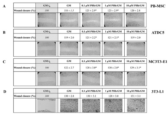 PHb acted as a weak modulator of migratory potential for all analyzed mesenchymal cells. At the concentrations of 0.1 and 1 μM, PHb slightly but significantly stimulated the migratory capacity of PB-MSCs and ATDC5 cells (Figure 3A,B). The same, significant stimulatory effect of PHb at all tested concentrations was observed in cultures of MC3T3-E1 cells (Figure 3C). Since the “scratch” in 3T3-L1 cells after 24 h in culture was almost entirely closed, PHb’s effect on the migratory capacity of these cells could not be analyzed (Figure 3D).