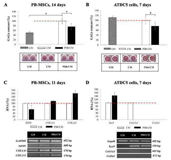 The results of the analysis showed that the GAGs content in PB-MSCs and ATDC5 cells grown in the presence of 0.1 μM PHb was lower compared to that of the cells cultured in CM only (Figure 4A,B). PHb decreased the expression of chondrogenic marker SOX9 in PB-MSCs, slightly stimulated the expression of COL1A1, and increased the expression of COL2A1 after 14 days in culture (Figure 4C). Contrarily, PHb stimulated the expression levels of Sox9 in ATDC5 cells and attenuated the expression of COL11A1, while the expression product of col2a1 was not identified in these cells using RT-PCR (Figure 4D).