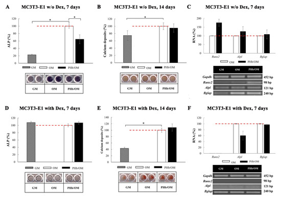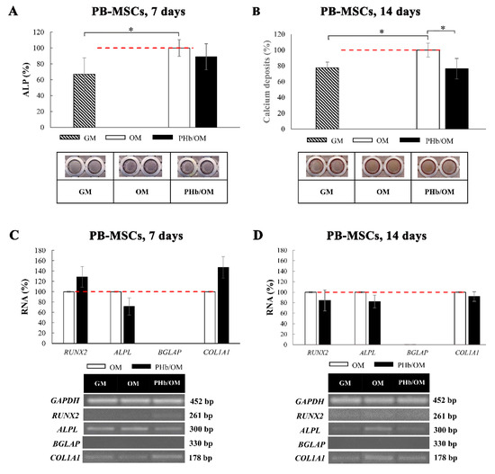 Osteogenic differentiation of PB-MSCs and MC3T3-E1 was induced by cultivating these cells in corresponding osteogenic differentiation medium (OM) (as described in Stančić et al. [16]). OM for PB-MSCs contained DMEM/5% FCS, 100 U/mL penicillin/streptomycin, 10 mM β-glycerophosphate (Sigma-Aldrich, Burlington, MA, USA), 10 nM Dex, and 50 μM ascorbic acid-2-phosphate. Two OMs were for MC3T3-E1 to capture the effect of PHb on different osteogenesis phases of these cells: (1) OM with Dex consisted of DMEM/5% FCS, 100 U/mL penicillin/streptomycin, 10 mM β-glycerophosphate, 50 μM ascorbic acid-2-phosphate, and 10 nM Dex and (2) OM without Dex, which consisted of DMEM/5% FCS, 100 U/mL penicillin/streptomycin, 10 mM β-glycerophosphate, and 50 μM ascorbic acid-2-phosphate. In all OMs, PHb was dissolved at a concentration of 0.1 μM. Osteogenic differentiation was confirmed by BCIP/NBT (5-bromo-4-chloro-3-indolylphosphate/p-nitroblue tetrazolium chloride) (Sigma-Aldrich, Burlington, MA, USA) staining for alkaline phosphatase (ALP), performed after 7 days of cultivation, and Alizarin red staining for calcium deposition and extracellular matrix mineralization after 14 days of cultivation, as described in Stančić et al. [16].