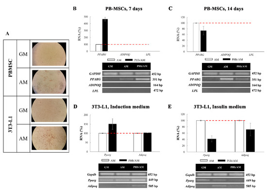 Differentiation of PB-MSCs and 3T3-L1 cells towards adipogenic lineage was confirmed by the presence of lipid droplets after Oil Red staining (Figure 7A). The expression of ADIPOQ (coding adiponectin) and LPL (coding lipoprotein lipase) was not detected in PB-MSCs after 7 or 14 days of incubation in AM (Figure 7B,C). The expression of PPARG (coding peroxisome proliferator-activated receptor gamma) was enhanced in the presence of 0.1 μM PHb after 7 days in culture (Figure 7B) and decreased after 14 days in culture with PB-MSCs (Figure 7C). PHb increased the expression of the Pparg gene when added starting from the induction medium and did not affect the expression of the Adipoq marker in 3T3-L1 cells (Figure 7D). The expression levels of both markers (Pparg and Adipoq) in 3T3-L1 cells were decreased when PHb was supplemented in insulin medium (Figure 7E).