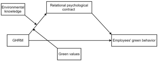 The individual-environment matching theory holds that the matching of knowledge and values between employees and enterprises is conducive to the establishment of harmonious relations between them. At present, there is a lack of research on introducing green values into the relationship between GHRM and the relational psychological contract and exploring the boundary conditions between GHRM and the relational psychological contract. The practice of GHRM should eventually be implemented by the employees of the enterprise. When employees have sufficient knowledge and corresponding values in this regard, they may have a higher sense of belonging to the organization and maintain an optimistic attitude towards the establishment of the relationship between themselves and the organization. Specifically, organizations will select candidates who match their own values or have relevant knowledge and provide green training to help them manage their knowledge in the GHRM practice so that they can have a deeper understanding of environmental protection. Therefore, the environmental knowledge and green values of the employees in the organization may also affect the establishment of employee relations in specific practices.