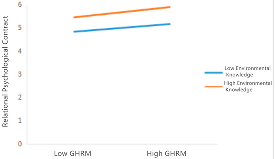 Although there is evidence that GHRM can lead to green behavior, according to its definition, GHRM leaves employees considerable freedom. The interaction between environmental knowledge and GHRM may strengthen employees’ willingness to cooperate with the organization, which also enhances the establishment of a relational psychological contract between the organization and employees, thus increasing the generation of employees’ green behavior [46].When employees are aware of environmental problems, the matching between the GHRM policy and its judgment will make employees have a better understanding of the organization’s green policy. The matching between their own knowledge and the organization’s policy will make it easier for employees to establish a long-term cooperative relationship with the organization. Therefore, the more environmental knowledge employees have, the more likely they are to establish a relational psychological contract. That is, employees’ environmental knowledge can adjust the impact of GHRM on the relational psychological contract.