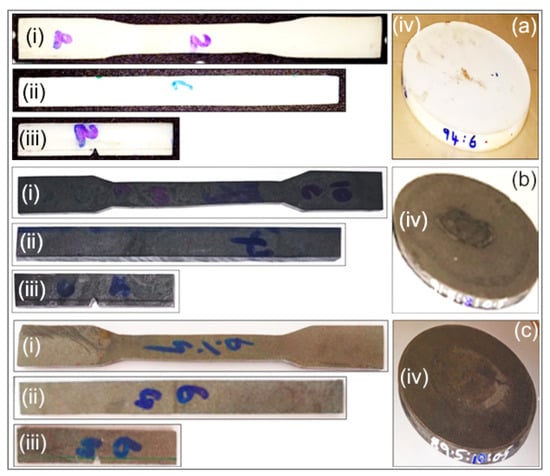 Photographs of specimens: (a) HGM/E composites, (b) HGM/CNT/E composites, and (c) HGM/G/E composites; (i) tensile, (ii) flexural, (iii) impact, and (iv) thermal conductivity.