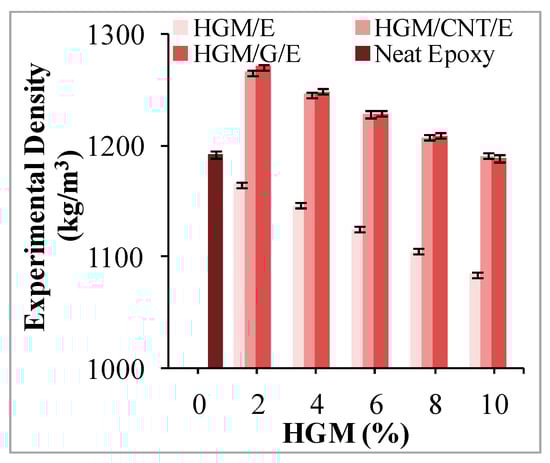Method of fabrication, uniform dispersion of constituents in the epoxy matrix, and lower void content significantly influenced the mechanical behavior of composites. Experimentally measured densities of different composites are depicted in Figure 4. Further, void content estimations, as well as theoretical and experimental density, are reported in Table 1. Experimental density values were lower than theoretical density values due to the entrapment of air in the composite encountered during fabrication. However, it was evident that the densities of all the composites declined with increasing hollow glass microballoon content. Hollow glass microballoons have an average density of 200 kg/m3, which is lower than neat epoxy by roughly six times. These microballoons, apart from possessing low density, are also hollow in nature; thereby, more space is utilized by the fillers in the composite. As a result, all the composites revealed a decrease in density values as the HGM content increased. Similar trends can be observed in [,,,]. Furthermore, HGM/E composites revealed lower density as compared with HGM/CNT/E and HGM/G/E. Further, the void content estimations indicated that observed values were minimal and can be neglected. The minute variations noticed in the standard deviations affirmed the consistency achieved in the fabrication of samples.
