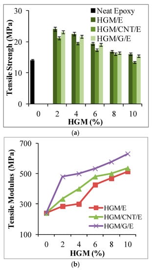 The response of composites to resist applied forces in tension is vital since it provides information the materials to resist when forces are applied in tension. Determining the tensile properties is crucial because it provides information concerning various tensile properties (elastic limit, tensile strength, modulus of elasticity, etc.). Tensile properties vary for every composites, and thereby tensile tests are performed to understand the behavior of different composites []. Tensile strength and modulus of HGM/E, HGM/CNT/E, and HGM/G/E composites are depicted in Figure 5. The tensile strengths of different HGM composites are presented in Figure 5a. It is noticed that when the amount of HGM in the composites increased, the tensile strength of the composites fell. This was because tensile strength is governed by bonding strength, effective load transfer, particle size, and particle loading, primarily adhesion between particles and matrix [,,,]. As the particle loading rose, the compatibility between the matrix and particles was lost due to insufficient matrix material to cover the particles, and load transfer decreased, resulting in the reduction of tensile strength. Comparing the tensile strength of HGM/E, HGM/CNT/E, and HGM/G/E composites, we found that the effect of additional reinforcements (carbon nano tubes and graphene) did not yield a significant change in the strength of the composites. Tensile modulus of HGM/E, HGM/CNT/E, and HGM/G/E composites are shown in Figure 5b. Contrary to the strength values, tensile modulus of all the composites depicted increasing trends with an increase in volume fraction of hollow glass microballoons. It is noted that the tensile modulus increased with an increase in reinforcing particle loading. This was because modulus depends on particle loading and not on particle/matrix adhesion, since the particles have a higher modulus than the matrix. Moreover, when the particles are nano-sized with a larger surface area, a nano effect is created that greatly enhances the stiffness. Comparing the tensile modulus of HGM/E, HGM/CNT/E, and HGM/G/E composites, we found that the addition of graphene resulted in the highest modulus yield when compared to carbon nano tubes, owing to their intrinsic mechanical characteristics and the strong interfacial bonding, which results in an improved interfacial stress transfer efficiency [,,].
