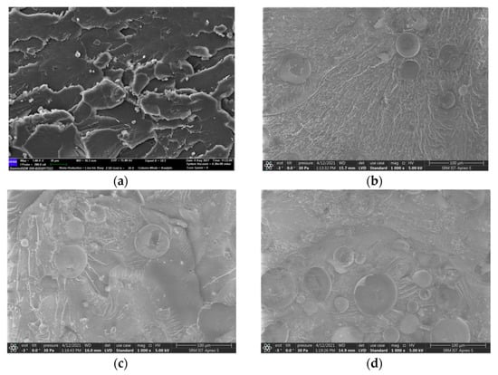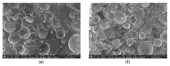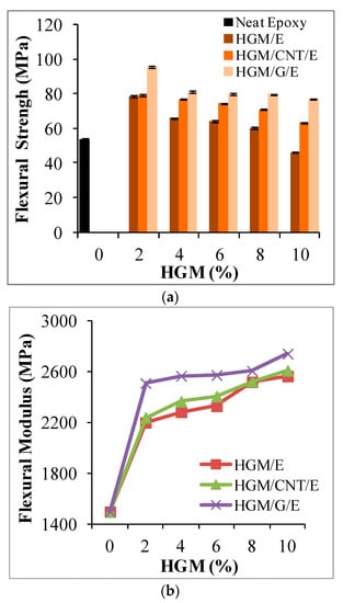 Composites’ ability to withstand bending deflection when subjected to various loads is termed as flexural strength. Composites designed for many products and applications require retention of flexural properties []. Figure 6a displays the flexural strength of HGM/E, HGM/CNT/E, and HGM/G/E composites. The strength of all the composites revealed trends similar to tensile behavior, wherein HGM/G/E depicted higher strength as compared with HGM/CNT/E and HGM/E. However, the strength of all the composites decreased with a rise in hollow glass microballoon content. Flexural modulus of HGM/E, HGM/CNT/E, and HGM/G/E composites are shown in Figure 6b. Modulus of all the composites depicts increasing trends with an increase in hollow glass microballoon content. A significant rise in modulus was seen with HGM/G/E composites, owing to an exceptionally high aspect ratio and higher modulus of graphene particles that assist in good load transfer from the matrix to reinforcements, thereby enhancing the overall modulus []. Similar trends were reported by [,,].