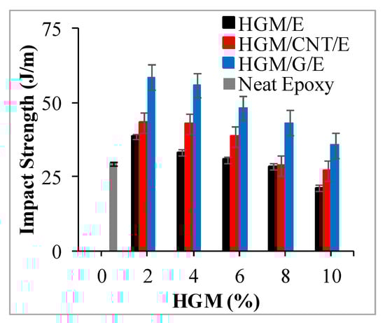 Composites’ response to sudden impact loads is the crucial property required for most of the envisaged applications. Comparison of impact strength of HGM/E, HGM/CNT/E, and HGM/G/E composites is depicted in Figure 7. With the increase in HGM content, the impact strength of the composites decreased for all the composites. This was due to the fact that the increase of hard reinforcing particles increased brittleness and clustering and hence decreased the impact strength at higher particle loading.