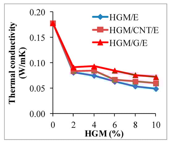 Thermal conductivity is an important property of composites designed for thermal applications. Low thermal conductivity of hollow glass microballoons and high aspect ratio of CNTs and graphene are beneficial in effectively building thermal networks []. Figure 8 compares the thermal conductivities of the HGM/E, HGM/CNT/E, and HGM/G/E composites. The thermal conductivity of all composites decreased with increasing HGM content. However, HGM/E composites revealed the lowest thermal conductivity as compared with HGM/CNT/E and HGM/G/E composites. The low thermal conductivity of HGM/E composites was mainly attributed to the ability of hollow glass microballoons to absorb moisture effectively. However, with the addition of CNT and graphene in the HGM/epoxy composites, the thermal conductivity increased by up to 4% by weight. This was because the thermal conductivity of graphene and CNT are higher than the thermal conductivity of HGM.