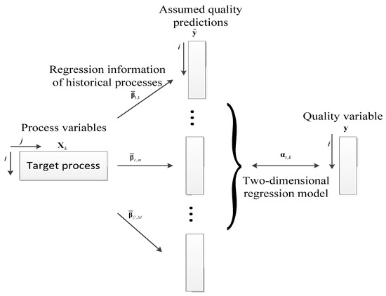 To adopt the same strategy to handle the multi-mode problem and the multi-phase problem at the same time, the strategy above will be applied to the intra-batch batch direction and handle the multi-phase problem by analyzing the intra-batch evolution. The framework of the two-dimensional, two-layer regression modeling strategy is shown in Figure 2. In the first regression layer, first, the PLS regression models are built between the process variables and quality variables of the historical processes with phase and mode indexes to get regression parameters. Then, using those regression parameters and the process variables of the target process, a series of assumed quality predictions can be obtained. Here, it is assumed that the target process belongs to each modeled process. This step connects all historical process information with the target process. Whether the information captured is related to the final quality of the target process will be judged in next regression layer. Consequently, in the second regression layer, based on these assumed quality predictions and real quality values of the target process, the PLS regression model is established, which captures the valuable information existing in the historical processes related to the final quality of the target process. Finally, by applying the two-dimensional, two-layer regression model, the final prediction quality can be obtained.