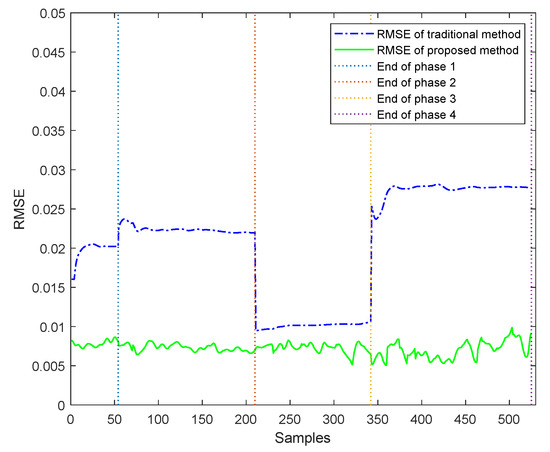 The mean RMSE of the quality predictions of the test batches from mode 3 by the traditional method is 0.0077, while the mean RMSE obtained by the proposed method is 0.0071, so the proposed method provides a more accurate prediction. The RMSE values of online quality predictions of the test batches using the two methods are shown in Figure 3. The dot dashed line is the RMSE value of the traditional method, the full line is the RMSE value of the proposed method, and vertical dotted lines are the phase boundaries. It can be seen from Figure 3 that the RMSE values of the traditional method have obvious phase variation, which indicates that the precision of the traditional method may be affected by different phase models. Therefore, the proposed method provides better quality prediction results than the proposed method. The RMSE values of the traditional method reflect obvious different phase characteristics because, in the traditional method, four models have been established for the four phases, while, for the proposed method, the RMSE values are not only lower than those of the traditional method within each phase but also keep a continuous low value throughout the four phases. This is because the proposed method mixes all process mode and phase information together in the first regression layer and then uses the second regression layer to extract valuable information for the target process. The results prove that using the two-layer regression method to judge the relationship between the target process and the historical processes is better than the traditional method based on phase division.