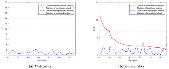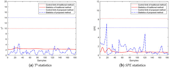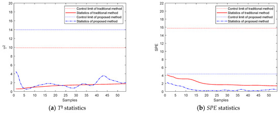 To simulate the sensor fault, a test batch with the pressure variable removed during the packing-holding phase is monitored. The T2 and SPE monitoring effects of the traditional method and the proposed method are shown in Figure 9, respectively. Compared with the traditional method, the amplitudes of the statistics of the proposed method are relatively larger. It can be concluded that the sensitivity of the proposed method is not affected, although it involves all quality-related phase and mode information in historical processes in the regression model, and it can identify the fault batch as fast as the traditional method, with an even larger alarm signal. So, the proposed method is better than the traditional method.