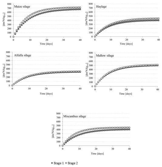 The biogas production rate (r) was determined for each experimental variant. The reaction rate constants (k) were determined based on the obtained experimental data by non-linear regression using Statistica 13.1 PL (Statistica 13.1 software, StatSoft Inc., Tulsa, OK, USA, 2016). The iterative method was applied in which the function is replaced in each iterative step with a linear differential with respect to the parameters determined. The coefficient of convergence φ2 was adopted as the measure of the curve’s fit (with the determined parameters) to the experimental data. This coefficient is the ratio of the sum square of the deviations of the values (calculated based on the constructed function) from the experimental values to the sum square of the deviations of the experimental values from the mean. The lower the value of the φ2 coefficient, the higher the convergence. The model was fitted to the experimental points so that the convergence coefficient did not exceed 0.2.