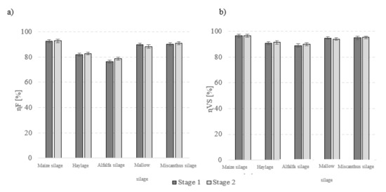 Conventional heating produced the best results when maize silage and Virginia mallow silage were used as fermentation feedstock (Table 4, Figure 1). Average biogas yields from conventionally-heated reactors were 680 ± 28 dm3N/kg VS for the former and 506 ± 16 dm3N/kgVS for the latter (p < 0.05) (Table 4, Figure 1). No significant variations in biogas yields were detected between the variants where miscanthus silage and haylage were used (p > 0.05). Methane fermentation of alfalfa silage produced the lowest biogas yields at 331 ± 13 dm3N/kgVS (Table 4, Figure 1). The largest methane fraction in the post-fermentation gas was obtained from alfalfa silage (54.9 ± 1.8% CH4), whereas the lowest levels were noted for haylage (51.6 ± 1.5% CH4). Based on the biogas production efficiency and methane content, the methane yield in stage 1 was determined to be the highest after maize silage fermentation (361 ± 12 dm3N CH4/kgVS), and lowest for alfalfa silage (181 ± 8 dm3N CH4/kgVS) (Table 4). No significant differences in methane yields were detected in any of the variants where miscanthus silage and haylage were used as fermentation substrates (p > 0.05). The biogas production rate was the highest for fermentation of maize silage and Virginia mallow silage. Alfalfa silage, on the other hand, performed the worst in terms of production rate (Table 5). The biogas production rate constant was the same for all fermentation substrates (Table 5). The highest values of ηF and ηVS were recorded for maize silage (i.e., 92.60 ± 1.1% (Figure 2a) and 96.40 ± 1.2% (Figure 2b), respectively). Conversely, the lowest values were obtained for alfalfa silage (i.e., 76.44 ± 1.2% ηF (Figure 2a) and 88.99 ± 1.2% ηVS (Figure 2b)).
