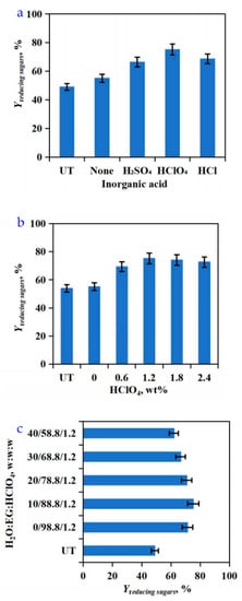 Effects of inorganic acid type (H2SO4, HClO4, or HCl) (1.2 wt%) on the yield of reducing sugars [EG 88.8 wt%, H2O 10 wt%, 130 °C, 0.5 h] (a). Effects of HClO4 dosage (0–2.4 wt%) on the yield of reducing sugars [130 °C, 0.5 h, EG 88.8 wt%] (b). Effects of EG loading (58.8–98.8 wt%) on the yield of reducing sugars [HClO4 1.2 wt%, 130 °C in 0.5 h] (c).