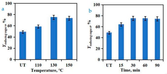 Effects of performance temperature (110–130 °C) for 30 min in EG-HClO4-water (88.8:1.2:10, w/w/w) on the yield of reducing sugars (a). Effects of pretreatment time (15–90 min) at 130 °C in EG-HClO4-water (88.8:1.2:10, w/w/w) on the yield of reducing sugars (b).
