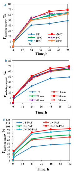 To further improve the performance of pretreatment, the effects of pretreatment time (10–50 min) were also examined at −20 °C. As illustrated in Figure 3b, pretreatment time had a significant influence on the enzymatic saccharification. The saccharifications of pretreated PAFs (20 g/L) were improved greatly compared to that of UT-PAF. After 72 h, the yields of reducing sugars from PAF pretreated for 10 min, 20 min, 30 min, 40 min, 50 min, and 60 min were 63.4%, 64.5%, 69.0%, 67.0%, and 65.3%, respectively. Obviously, the highest yield of reducing sugars was observed at 0.5 h. Thus, 0.5 h was chosen as the optimal time for UN pretreatment at −20 °C.