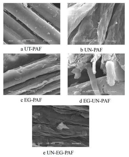 The structural features (e.g., porosity, morphology, and crystallinity) of PAFs were characterized with SEM. Figure 4 illustrates the morphology difference of UN-PAF and pretreated PAFs. UT-PAF had a smooth surface. While UN-PAF, EG-PAF, UN–EG-PAF, and EG–UN-PAF had significant cracks and rougher surfaces compared to UT-PAF. These results indicated that more cellulose was exposed on the surface after the pretreatment, which was consistent with the results of the chemical composition analysis of pretreated PAFs. Overall, these pretreatments showed an obvious effect on hemicellulose removal and delignification, which would result in the enhancement of enzymatic saccharification [34,37].