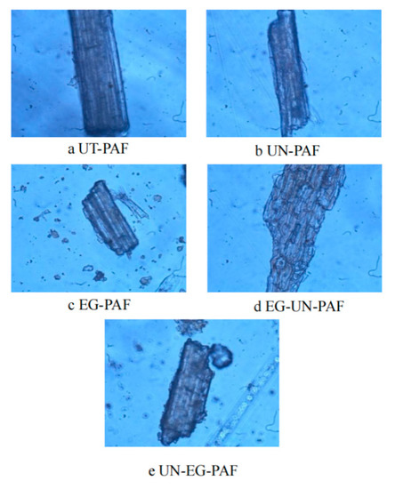 The FTIR spectra of PAF samples before and after pretreatment were recorded in Figure 6b. The peak near 900 cm−1 is related to the β-glycosidic bond among carbohydrates [45]. The peak near 1048 cm−1 is associated with C-O stretching [46]. The enhancement of absorption spectra at 1000–1200 cm−1 for the pretreated one indicated the increase in cellulose recovery in the solid residue. The peak near 1276 cm−1 is associated with C-O stretching vibration. The peak near 1383 cm−1 is ascribed to C-H bending [47]. The peak near 1418 cm−1 is attributed to the CH2 bending [48]. The peak near 1630 cm−1 is associated with the absorbed water bending vibrations [49]. UN-PAF, EG-PAF, EG–UN-PAF, and UN–EG-PAF separated lignin from the fibers. A decrease was found in the absorbance of the 1730 cm−1 band assigned to the carbonyl functional groups from hemicellulose for UN-PAF relative to UT-PAF. The absorption peak at 2900 cm−1 is assigned to CH2 stretching vibration [50]. The peak near 3400 cm−1 is attributed to the O-H stretching of the hydrogen bonds [51].