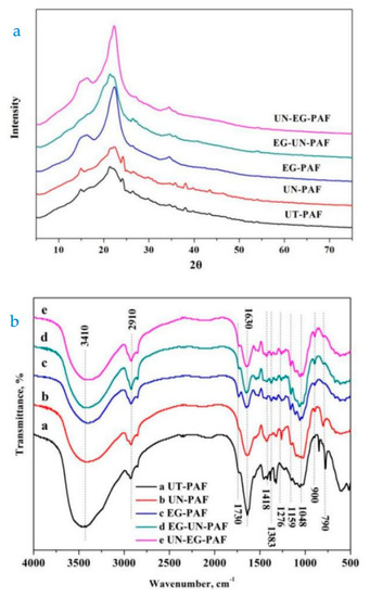 XRD (a) and FTIR (b) images of untreated and pretreated PAFs.