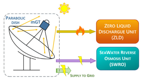 The main concept of SOLMIDEFF [10], a project funded by the Spanish National R+D+i Programme focused on societal challenges, is illustrated in Figure 1. A parabolic dish collector is used to collect and concentrate solar energy onto a focal plane where the power conversion unit (PCU) is installed. The PCU is comprised of a micro gas turbine engine (mGT) and a solar receiver. The compressor of the mGT swallows atmospheric air, which is compressed and fed into the solar receiver through the recuperative heat exchanger, which increases the temperature of this high-pressure air stream by harvesting the thermal energy of the hot gases flowing out from the turbine. The receiver is also a heat exchanger, which transfers the concentrated solar energy received from the collector to the incoming stream of pressurised air, delivering air at high pressure and temperature. This air, typically at around 800 C, is then expanded across the turbine, where power is produced to drive both the compressor and the electric generator. The gases exhausting from the turbine are discharged to the atmosphere but, before this, they flow across a counter-current heat exchanger, where their thermal energy is used to preheat compressor delivery air before flowing into the solar receiver. The bottoming system of the SOLMIDEFF concept is comprised of two elements. An advanced desalination unit based on reverse osmosis technology is driven by the electric power produced by the micro gas turbine. This RO unit produces fresh water and a brine with a high concentration of salts that is treated further in the second element of the bottoming system. This is a zero liquid discharge unit driven by the waste heat available in the exhaust of the micro turbine (air at some 250–300 C), which evaporates a fraction of the water content in the brine, yielding a final brine with a higher concentration; therefore, it has lower environmental impact and is easier to handle.