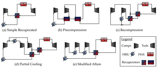 Five different power cycles are considered, identified in previous works by some of the authors of this work [35]: simple recuperated, precompression, recompression, partial cooling and modified Allam. These four configurations were already discussed in the previous section and their layouts are provided in Figure 2. On the other hand, the modified Allam cycle is a modification of Allam adapted to operation on pure-CO embodiment (without oxy-combustion), and basically consists of a simple recuperated cycle enhanced with a two-stage intercooling (see Figure 2a,e).