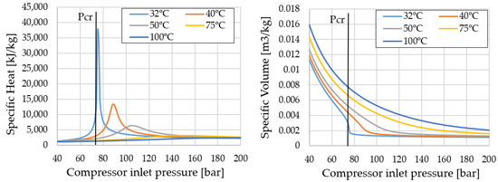 The history of sCO technology finds its roots in the independent but almost contemporaneous studies of Edward Feher [12] and Gianfranco Angelino [13,14,15,16] in the 1960s. Their seminal works lie within the general scope of closed-cycle gas turbine analysis, which had a significant interest in the second quarter of the XIX century, but focused on an innovative topic: thermodynamic cycles working near the critical point, employing carbon dioxide (and other innovative working fluids) as working fluid. On the one hand, Feher investigated the simple recuperated supercritical cycle (see Figure 2a) and performed a sensitivity assessment to the main operating parameters (maximum cycle temperature, minimum cycle temperature and minimum cycle pressure) as well as to the performance of the individual components (recuperator effectiveness, and turbomachinery isentropic efficiency). The reasons for considering supercritical CO as alternative working fluid were, and remain, multiple: high thermal stability, low chemical reactivity, abundant in nature, non-flammable and inexpensive [17]. Nevertheless, its differential features are the critical temperature and pressure at 31.04 C and 73.83 bar, respectively. This moderate value of temperature, very close to ambient, allows to perform the compression process near the critical point with conventional cooling systems, whilst the moderate critical pressure avoids mechanical requirements that are beyond what is practical with state-of-the-art technology. In the proximity of the critical point, a drastic decrease in specific volume occurs (Figure 3), resulting in a significant reduction in compression work when compared to other closed-cycle turbines using hot air or helium (Equation (1)).