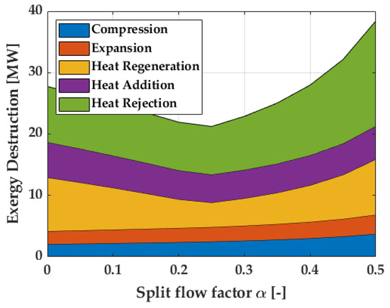 The recompression cycle is the most widespread supercritical CO layout (Figure 2c). The heat recovery process is divided in two heat exchangers, a high-temperature recuperator (HTL) and a low-temperature recuperator (LTR). The flow in the low-pressure outlet of the LTR is also split in two: a fraction is sent to the heat rejection unit (HRU) and the main compressor, whereas the remaining flow is directly compressed and mixed with the high-pressure outlet of the LTR. Thanks to this arrangement, the heat capacity of the high-pressure stream in the LTR can be reduced (reduction in the circulating mass flow), while the heat capacity of the low-pressure side remains the same. Even if cycle-specific work is reduced due to a higher compression power (a fraction of the flow is compressed far from the critical point), the thermal efficiency is considerably enhanced thanks to the higher effectiveness of the heat recuperators. A demonstration of this is provided by Figure 4, which shows that increasing the split flow factor (i.e., fraction of the mass flow that goes to the recompressor) significantly reduces the exergy destroyed in the heat recuperators at the expense of only of a small increase in exergy destruction across the compression and expansion processes. The amount of exergy destroyed in each cycle component is obtained using the correlation presented in Equation (2), making use of the concept of product exergy (E), fuel exergy (E) and exergy losses (E), k being a generic component. A thorough explanation of the methodology is available from the original paper by Penkhun and Tsatsaronis in [19], and it has already been employed by some of the authors in [20].