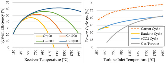 Finding the optimal maximum operating temperature in a concentrated solar power system is a trade-off between power block efficiency and thermal losses of the receiver [33]. This can be seen in Figure 5 (left), where system efficiency, calculated as the product of solar receiver and power block efficiencies, is expressed as a function of the concentration ratio and receiver temperature. For solar tower technology, the concentration ratio is typically in the order of 1000, and thus the optimum receiver temperature is between 650 and 950 °C. It is in this region that the sCO cycle outperforms the Rankine cycle and gas turbine, as seen in Figure 5 (right).
