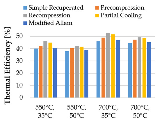 Thermal efficiency of the sCO configurations studied, for different boundary conditions.