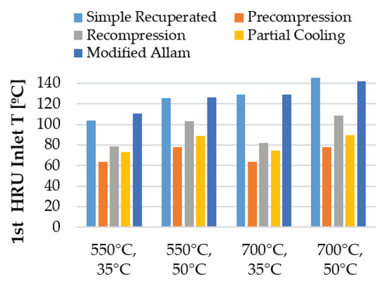 Once thermal performance and operating conditions of the different sCO systems are assessed, the integration with desalination is analysed. To this end, Figure 7 shows the temperature at which heat is rejected from each cycle, a key parameter to assess the feasibility of thermal desalination. Regarding the recompression cycle, the inlet temperature of the heat rejection temperature rises with both T and TIT, with a stronger dependence on the former. At 35 C, for both values of TIT, the inlet to the HRU is at around 80 C, while it increases to 102–108 C at 50 C. The two configurations incorporating a precompressor, precompression and partial cooling, present very low inlet temperature to the HRU (around 60–80 C), which in turn varies randomly with boundary conditions. The simple recuperated and modified Allam cycles exhibit the highest HRU inlet temperatures, with values higher than 100 C at 550 C/35 C and around 140 C at 700 C/50 C.