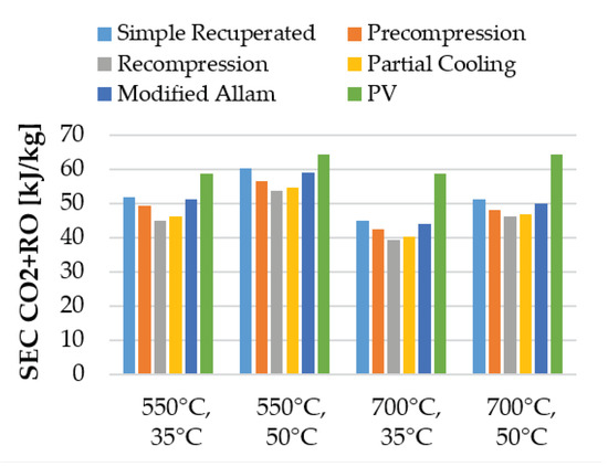 Specific energy consumption [kJ/kg] of fresh water desalination using sCO power cycles and reverse osmosis (including 0.75 kWh/m auxiliary power consumption). Green bars correspond to PV-RO systems with 18% solar-to-electric efficiency.
