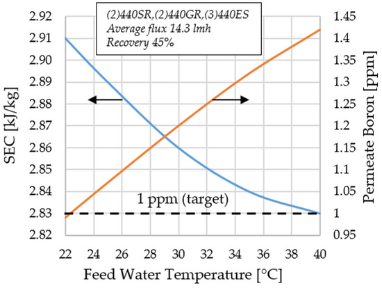 Finally, it is worth noting that the specific energy consumption could be further reduced if the heat rejected from the cycles is used to decrease the power consumption of the RO unit. To that end, the strategy of preheating the feed water stream is explored. The effectiveness of the strategy is studied separately for each reference plant. For Santa Cruz de Tenerife, the feed water temperature is increased from 22 C (design case) to 40 C, but this brings about a negligible SEC reduction from 2.91 kWh/m to 2.83 kWh/m according to Figure 9. In addition, the quality of the permeate water deteriorates significantly, exceeding the allowable concentration of boron. Moreover, the adoption of specific designs to increase the rejection of salt from the pressure vessels at each temperature level completely offsets the SEC reduction obtained from the preheating of feed water. For such reasons, the preheating strategy (i.e., increasing temperature with respect to design temperature) is not recommended for plants where the design is driven by the quality of fresh water.