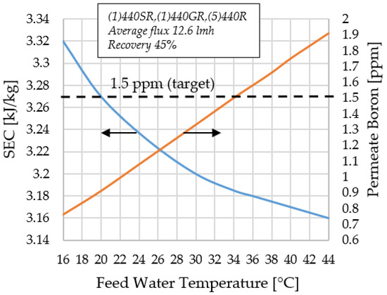 The Persian Gulf case yields a different situation. According to Wilf [39], the sea water temperature oscillates from 16 C to 34 C over the year. The influence of temperature on SEC and on the concentration of boron in the product in the plant located in the Persian Gulf is illustrated in Figure 10. Again, achieving temperatures higher than the design value are not interesting for the exact same effect on product quality. On the other hand, a significant SEC increase from 3.19 kWh/m to 3.32 kWh/m (4%) is experienced when the temperature of feed water temperature drops to the lower bound of 16 C. It is true that, in these conditions, the waste heat from the sCO cycle could be used to increase the feed water temperature to the design value (34 C); nevertheless, the maximum improvement attainable is limited to 0.13 kWh/m for the coldest days in the year, thus compromising the cost effectiveness of such a preheating strategy. A thorough techno-economic assessment on an annual yield basis is here mandatory.