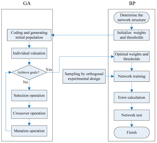 BP algorithm is a local search optimization method [20], it is easy to fall into local optimum, especially when the quantity of the sample is small, but we need to find the global optimal solution in structural optimization. Genetic algorithm has a good global search ability, and it can quickly search out all solutions in the solution space without falling into the trap of local optimal solutions; it can take advantage of inherent parallelism to solve quickly. However, the local search ability of genetic algorithm is poor, which makes the pure genetic algorithm time-consuming, and the search efficiency is low in the later stage of evolution. Therefore, GA and BP algorithm are combined to find the optimal solution in structural optimization. In addition, the orthogonal experimental design can provide the most typical samples. The calculation flowchart of the combined method is shown in Figure 2.